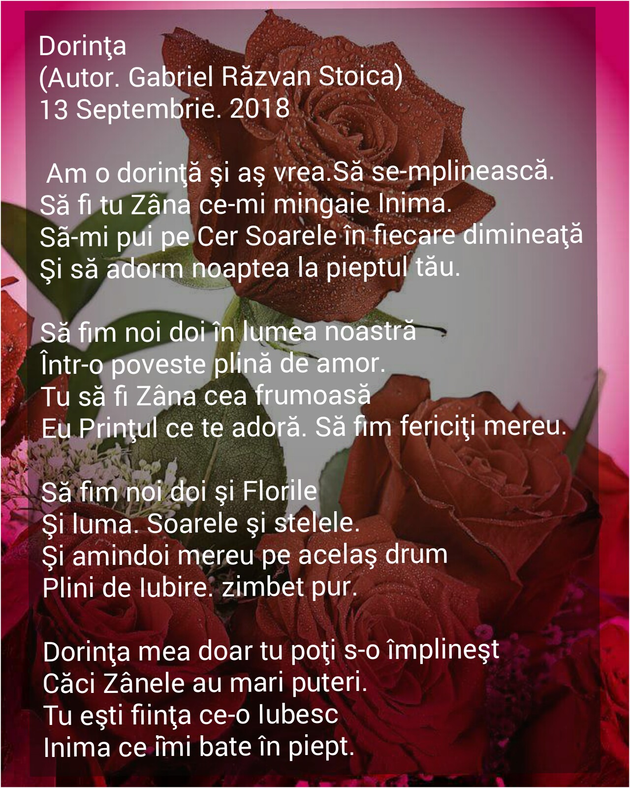 - Va invit in lumea pura a Poeziei,..Lasa-ti gandurile sa zboare,Lasa-te purtat pe aripile visurilor Inchide Ochii citind Poezia si te vei regasi intr-o lume de Poveste...Traieste frumos,Gandeste pozitiv si fi optimist..Invinge tristetea cu zimbete,Ignora rautatea si plateste cu bunatate celor ce te dujmanesc..Bucura-te de tot ce te-nconjoara..Fi un Om bun.Cu Drag.Gabriel Razvan Stoica